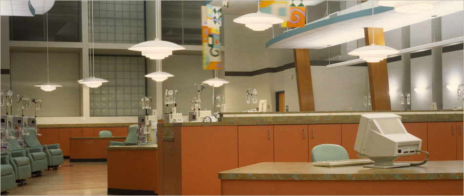 The clinic is housed in a renovated synagogue. The main treatment area features cloud-like formations and colorful banners suspended from the high ceiling.